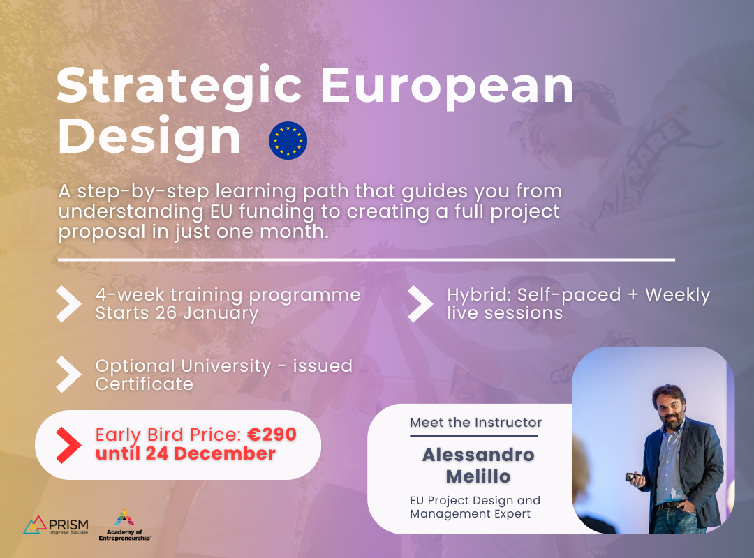 Θα θέλαμε να σας παρουσιάσουμε το νέο μας πρόγραμμα Strategic European Design, ένα εκπαιδευτικό, εισαγωγικό, αγγλόφωνο πρόγραμμα 4 εβδομάδων για τον σχεδιασμό ευρωπαϊκών έργων.