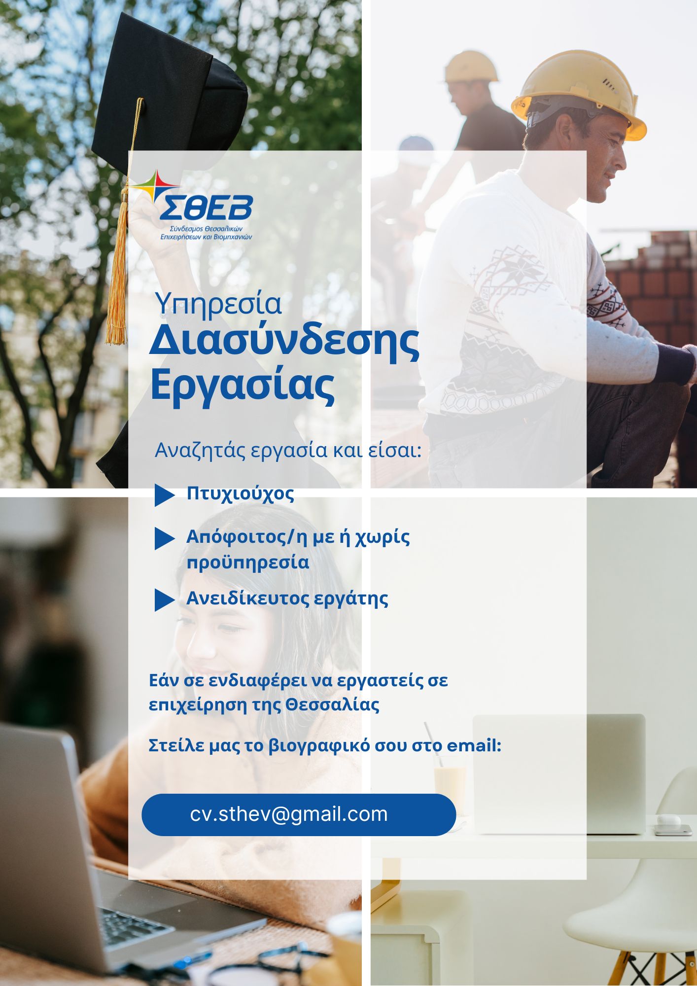 Σας ενημερώνουμε ότι ο Σύνδεσμος Θεσσαλικών Επιχειρήσεων και Βιομηχανιών (ΣΘΕΒ), παρέχει την Υπηρεσία Διασύνδεσης Εργασίας του Συνδέσμου που λειτουργεί με στόχο την υποστήριξη φοιτητών και αποφοίτων στην είσοδό τους στην αγορά εργασίας.
