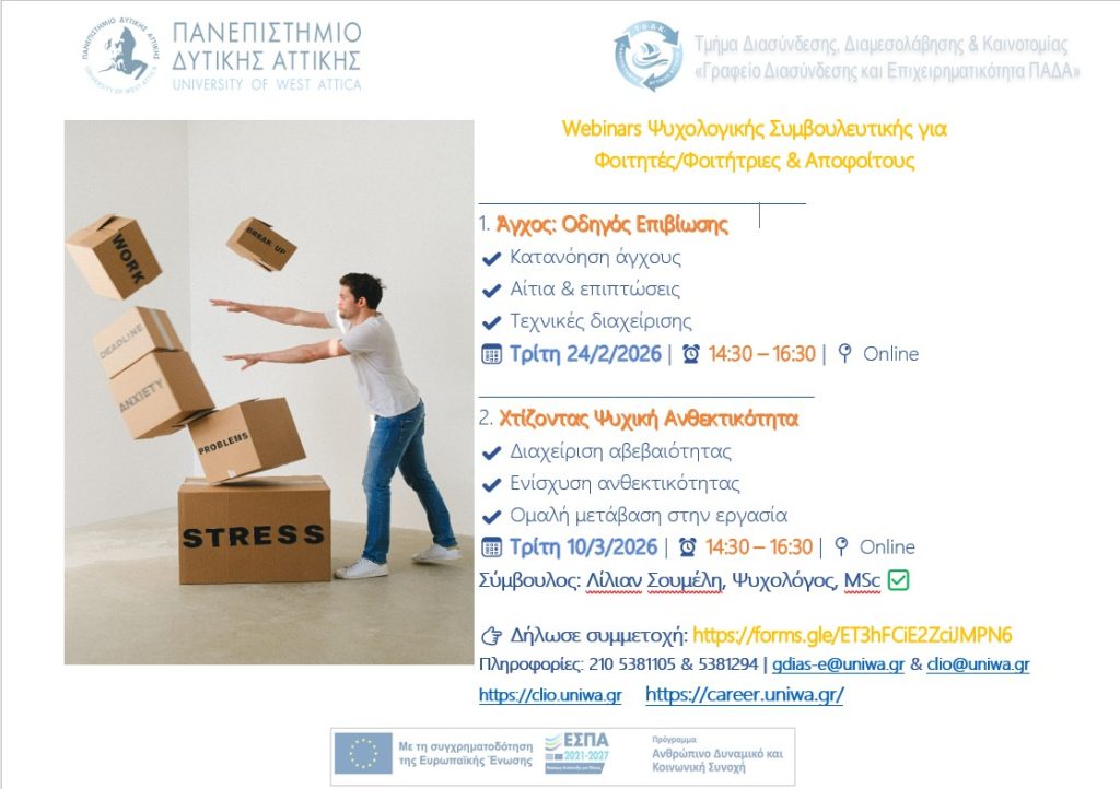 Το Τμήμα Διασύνδεσης, Διαμεσολάβησης & Καινοτομίας (Τ.Δ.Δ.Κ.) του Πανεπιστημίου Δυτικής Αττικής, στο πλαίσιο του Υποέργου 2: «Γραφείο Διασύνδεσης & Επιχειρηματικότητα ΠΑΔΑ» -με Επιστημονικό Υπεύθυνο, τον Αναστάσιο Σεπετή, αναπ. Καθηγητή του Τμήματος Διοίκησης Επιχειρήσεων,- της Πράξης: «Υπηρεσίες Υποστήριξης Φοιτητών του Πανεπιστημίου Δυτικής Αττικής στην ένταξή τους στην αγορά εργασίας», που υλοποιείται στο πλαίσιο του «ΕΠΙΧΕΙΡΗΣΙΑΚΟΥ ΠΡΟΓΡΑΜΜΑΤΟΣ «Ανθρώπινο Δυναμικό και Κοινωνική Συνοχή 2021-2027» προσκαλεί τους/τις φοιτητές-ριες και αποφοίτους-ες σε webinars ψυχολογικής συμβουλευτικής για τους μήνες Φεβρουάριο-Μάρτιο 2026, με εισηγήτρια την Υπεύθυνη Ψυχολογικής Συμβουλευτικής, κα Λίλιαν Σουμέλη, Ψυχολόγο MSc, 2105381105, lsoumeli@uniwa.gr. Τα webinars θα πραγματοποιηθούν online στην πλατφόρμα Microsoft Teams και οι ενδιαφερόμενοι-ες θα λάβουν με email το link συμμετοχής τους πριν την έναρξη.