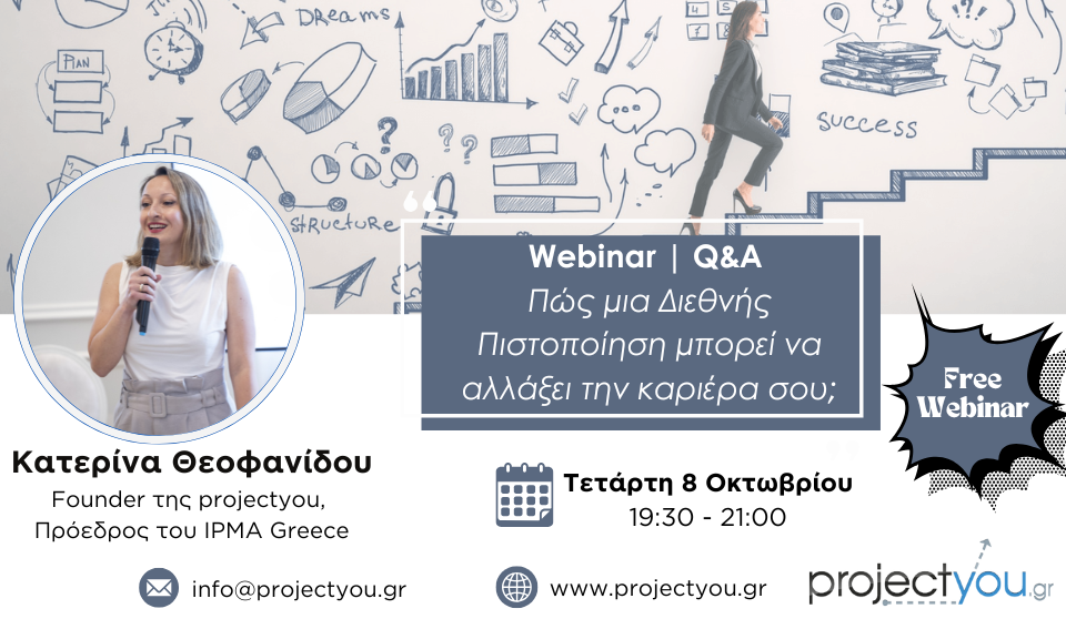 Εκ μέρους της projectyou σας ενημερώνουμε για το δωρεάν διαδικτυακό webinar & Q&A με θέμα: «Πώς μια Διεθνής Πιστοποίηση μπορεί να αλλάξει την καριέρα σου;», που θα πραγματοποιηθεί την Τετάρτη 8 Οκτωβρίου στις 19:30.